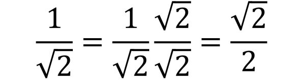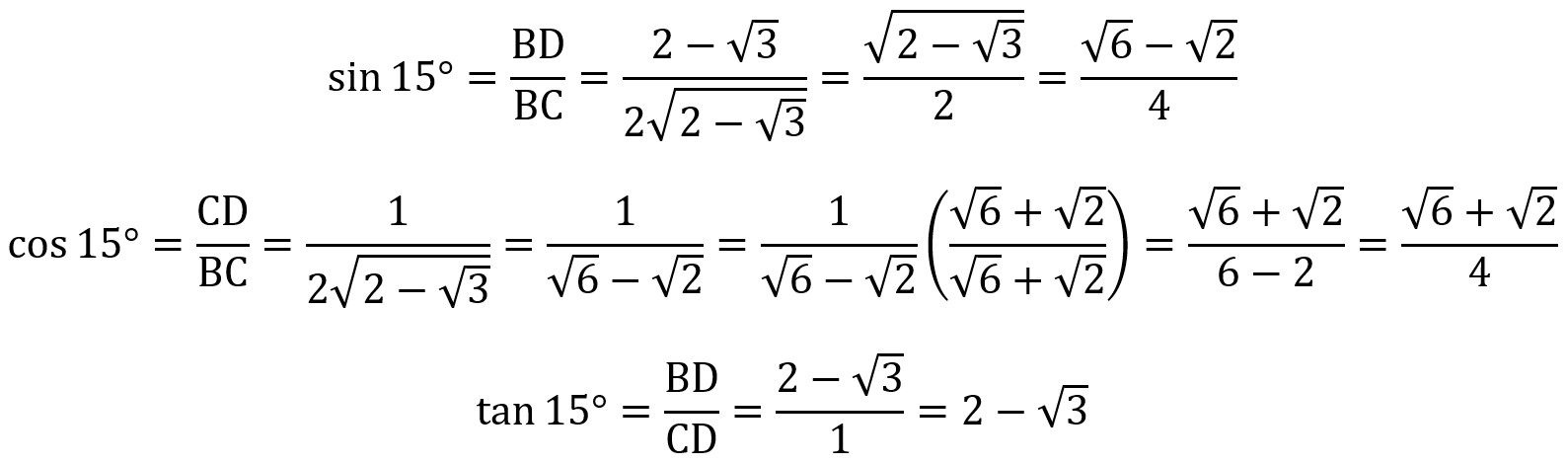 Now that we know BC, BD, and CD, we can easily find the sine, cosine, and tangent of 15°. In triangle BCD, note that BD is opposite to 15°, CD is adjacent to 15°, and BC is the hypotenuse. For the sine of 15°, note that (2 – sqrt(3)) / sqrt(2 – sqrt(3)) = sqrt(2 – sqrt(3)) for the same reason that x/sqrt(x) = sqrt(x). For the cosine of 15°, the answer 1/(sqrt(6) – sqrt(2)) is equivalent to the answer (sqrt(6) + sqrt(2))/4. Both answers approximately equal 0.965925826 on a calculator, but the rightmost expression is considered to be “standard form” because it has a rational denominator. We multiplied the numerator and denominator each by (sqrt(6) + sqrt(2)) in order to rationalize the denominator. This is called “multiplying by the conjugate.” The conjugate of sqrt(6) – sqrt(2) is sqrt(6) + sqrt(2) because the product of these two conjugate expressions is rational. When applying the “foil” method, the irrational terms cancel out.