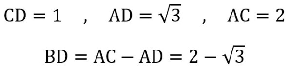 Now we know that the altitude of triangle ABC is CD = 1, which is one side of triangle BCD. We can find side BD by subtracting AD from AB. Since AB = 2 and AD = sqrt(3), we get BD = 2 – sqrt(3).