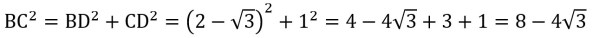 Recall that BD = 2 – sqrt(3) and that CD = 1. After applying the Pythagorean theorem, apply the “foil” method from algebra: (x – y)² = x² – 2xy + y². Recall that (sqrt(3))² = sqrt(3) × sqrt(3) = 3.
