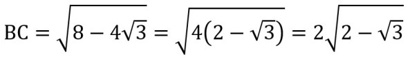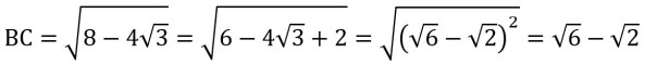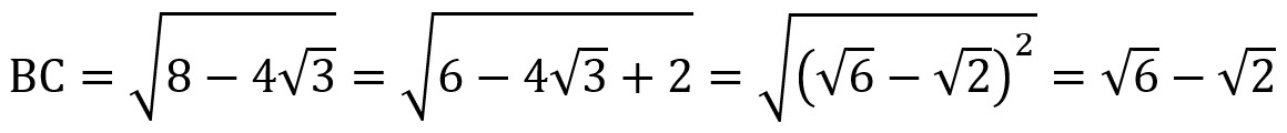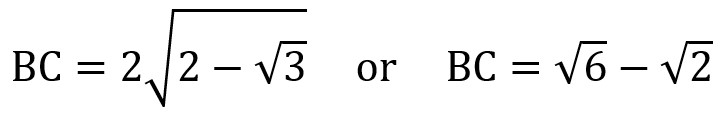 Since BC = 2 sqrt(2 – sqrt(3)) and BC = sqrt(6) – sqrt(2), it follows from the transitive property that 2 sqrt(2 – sqrt(3)) = sqrt(6) – sqrt(2). Divide both sides by 2 to get the following: