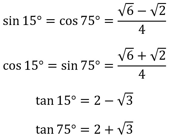 Note that the sine of 15° is equivalent to the cosine of 75°, and that the cosine of 15° is equivalent to the sine of 75°. What is “opposite” for 15° is “adjacent” for 75°, and vice-versa. For the tangent of 75°, we again multiplied by the conjugate in order to rationalize the denominator.