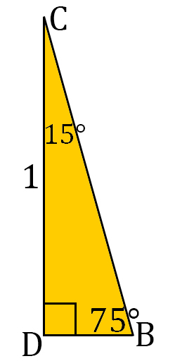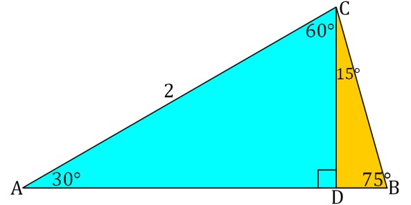 With side AB serving as the base, draw an altitude down from point C, as shown below. This divides the isosceles triangle into two right triangles. Triangle ACD is a 30°-60°-90° triangle and triangle BCD is a 75°-15°-90° triangle.