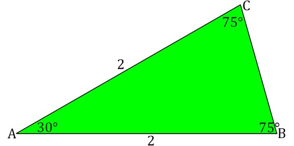 The trick is to begin with a 75°-75°-30° isosceles triangle, as shown above. Let AB = AC = 2. These are the sides opposite to the 75° angles. The remaining side, BC, is unknown at this point.